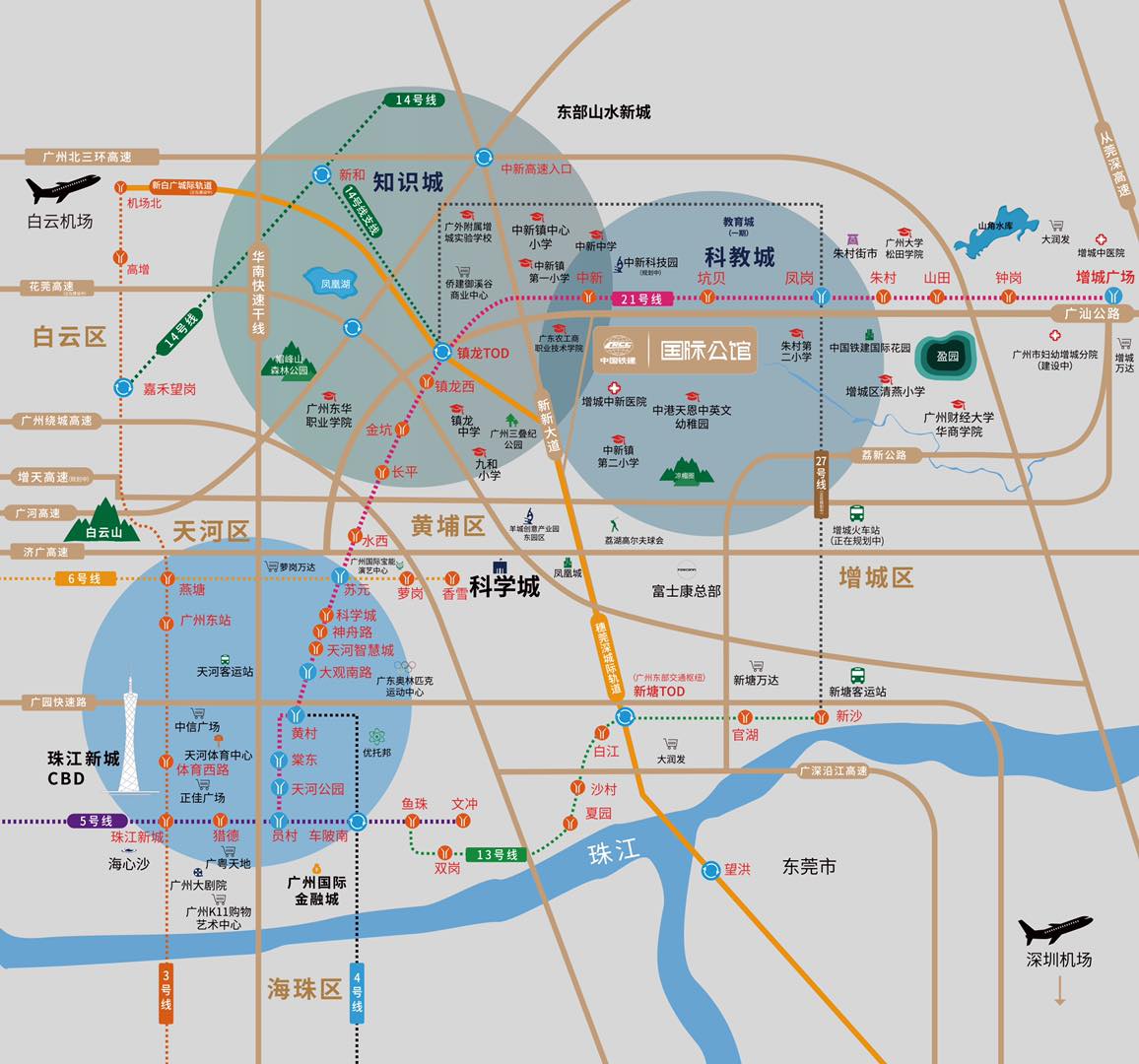其他:规划3条地铁线路,14号线/21号线/27号线,项目2公里范围内有中新/坑贝地铁站(21号线);距项目约50米有公交站景新国际站,行经线路有增城11路、增城370路 高快/快速路:现有“三横三纵“的公路高速路网,其中包括新新公路、广汕公路、从莞深高度、广河高速、珠三角环线高速、济广高速;规划建设中的有增天高速 交通枢纽:新塘TOD,项目坐拥国家高铁(广深、广汕、京九)、城际轨道(穗莞深及穗莞深城际琶洲支线)、城市地铁(广州地铁13号线、16号线)等共7大轨道交通及一体化公交网络,30分钟可到达广深两大国际机场,90分钟可到达珠三角地区任一城市 机场:广州正果国际机场(规划建设中)