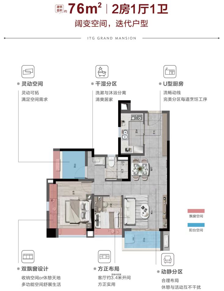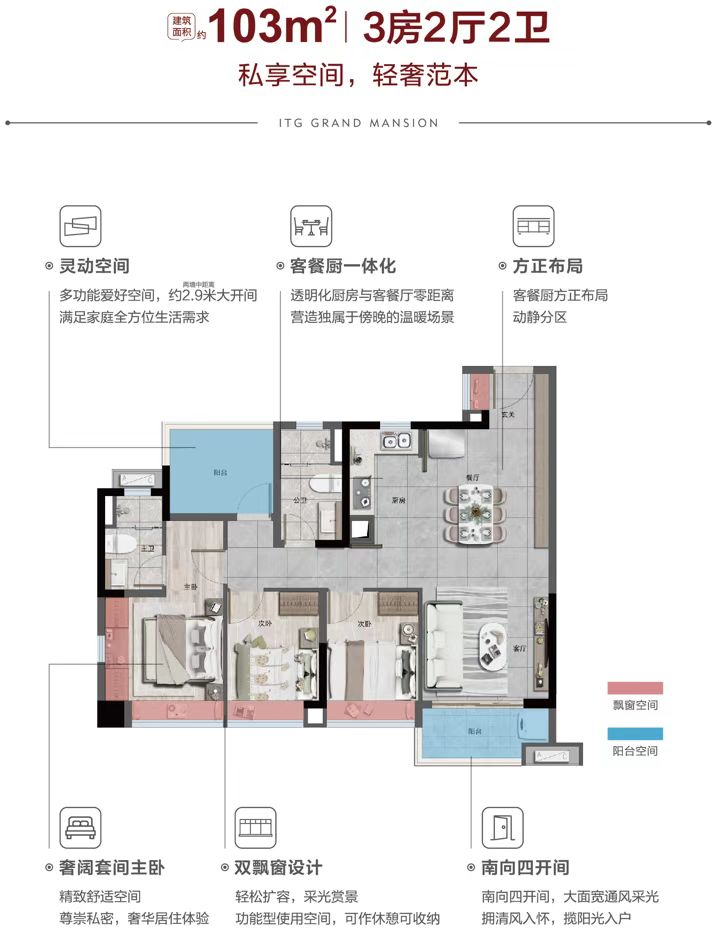 【产品】:新生代产品系代表作,4.0展蝶楼型,国际现代立面,约8.4万㎡坡地中央大园林,建面约76-103㎡轻奢阔变2-3房,餐厨一体化,局部户型次卧满飘窗赠送,约85%超高实用率
