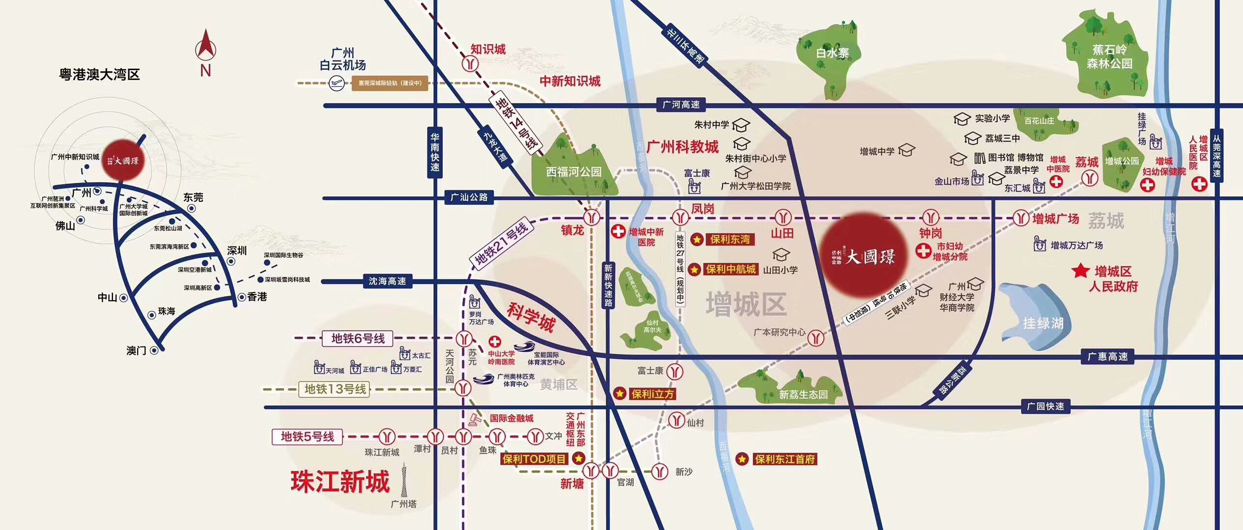 1. 位于荔城与朱村板块的轴心位置,地铁21号线钟岗站,向东一站到增城广场,向西通过快线,速达天河