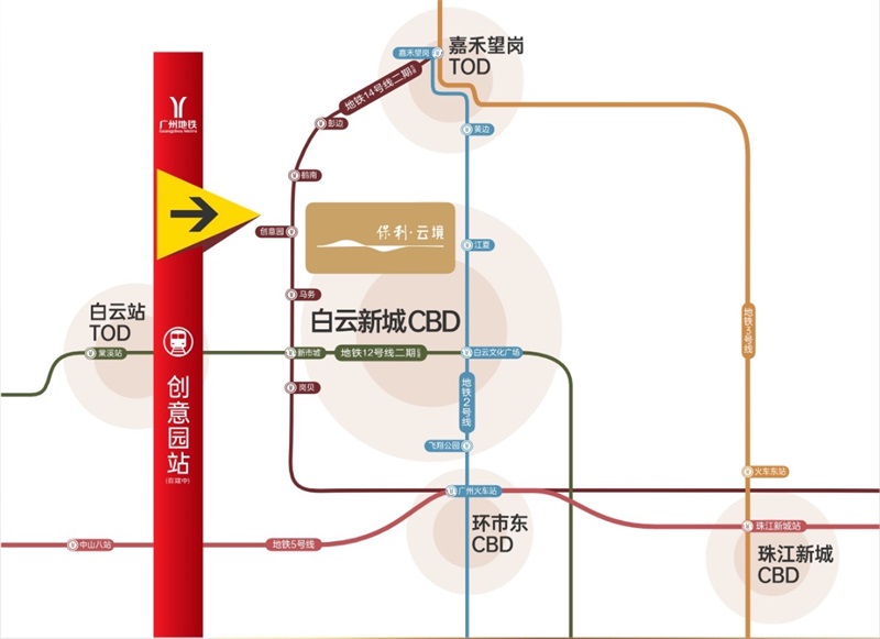 【双地铁】近 14 号线二期/2 号线,约 600m(直线距离)即达 14 号线二期(在建中)创意园站,接驳白云 TOD 迅达广州各大中心区,向南联通越秀广州火车站,换乘 5 号线直达珠江新城 CBD,向北接驳嘉禾望岗(3/14 号线)。