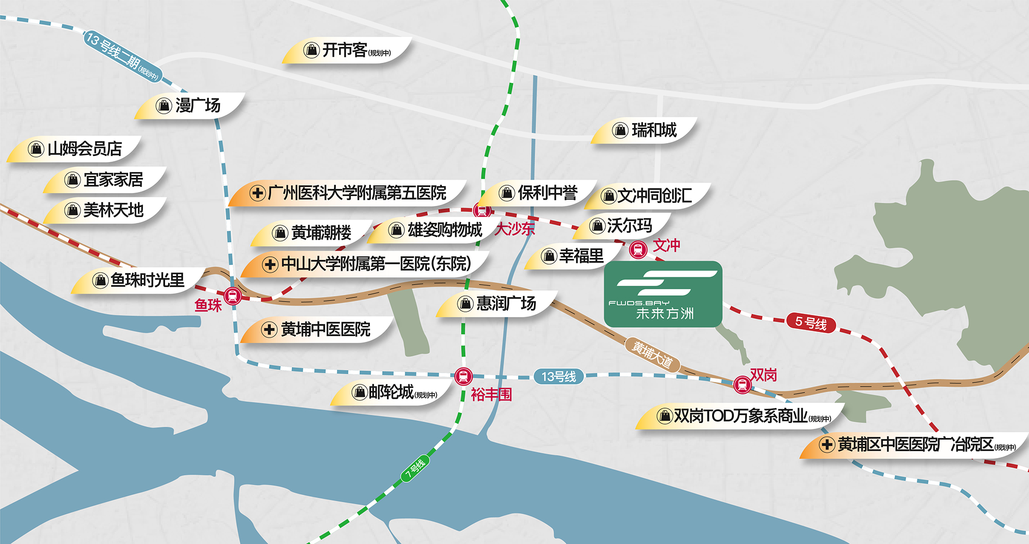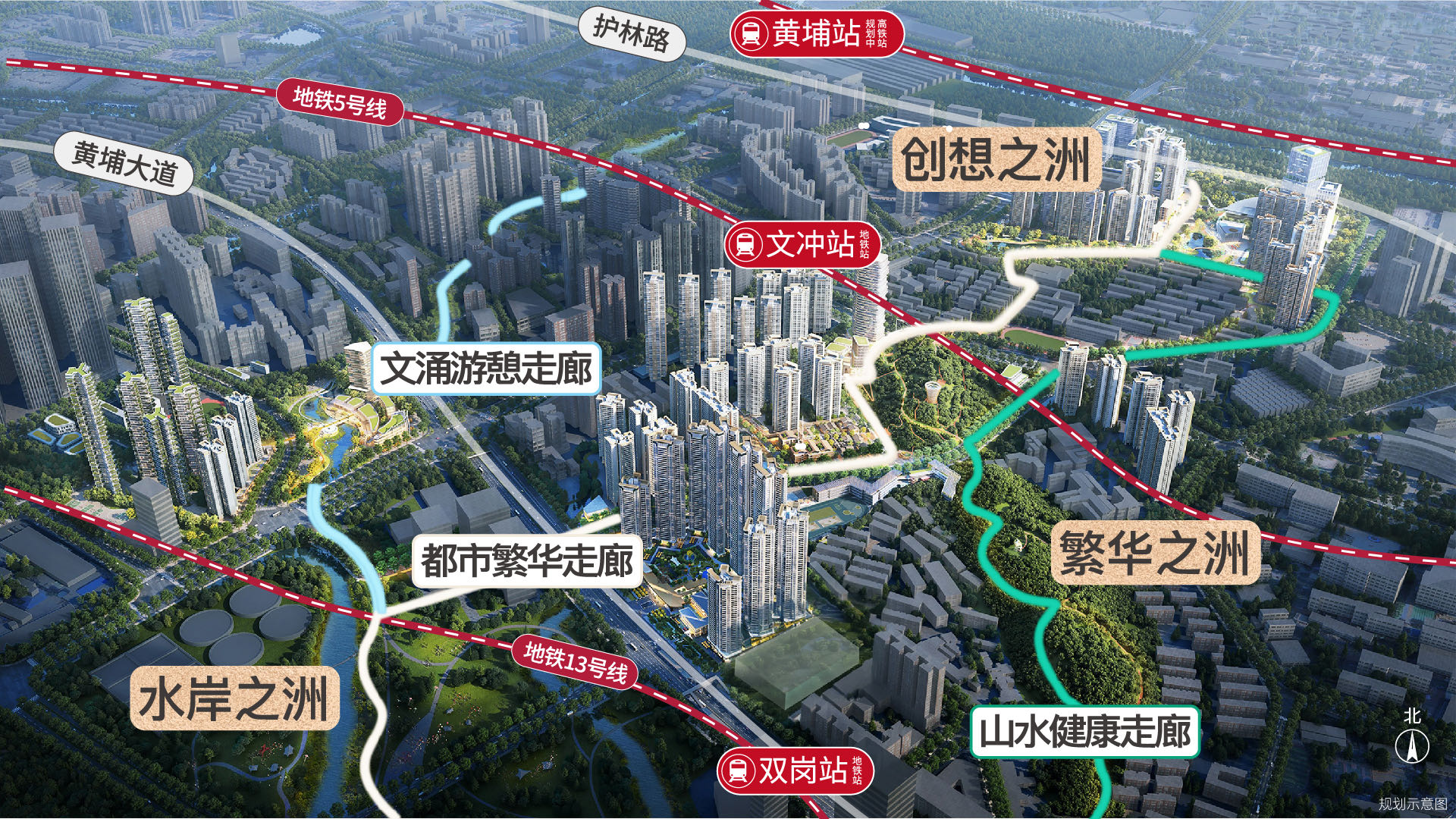 通达之洲双地铁上盖,快链慢行随时出发5号线文冲站、13号线双岗站双地铁轻松出行,规划多个生活主题漫步游径,举步穿越古今