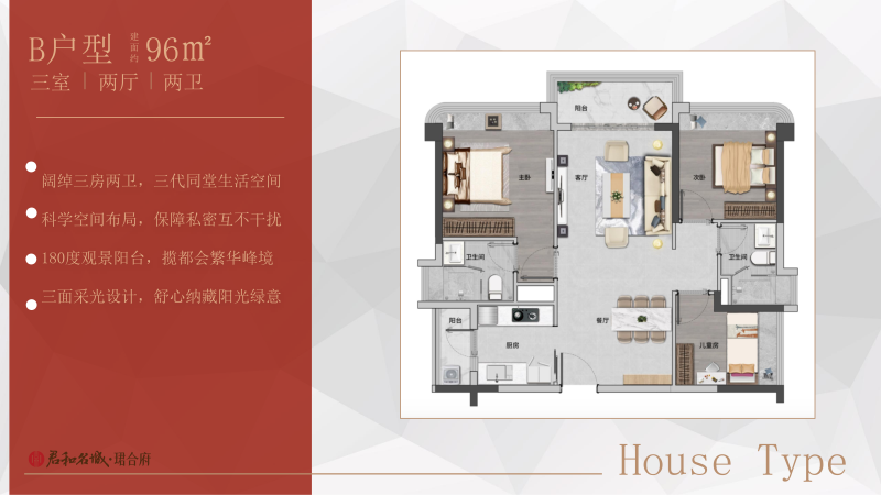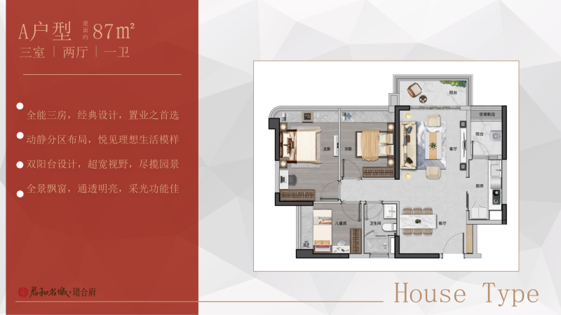 【产品 】科学的L型楼栋布局,每一栋做到宽阔楼距,南北朝向,采光充沛。首推建面约87-100㎡阔景三房,丰俭由人。