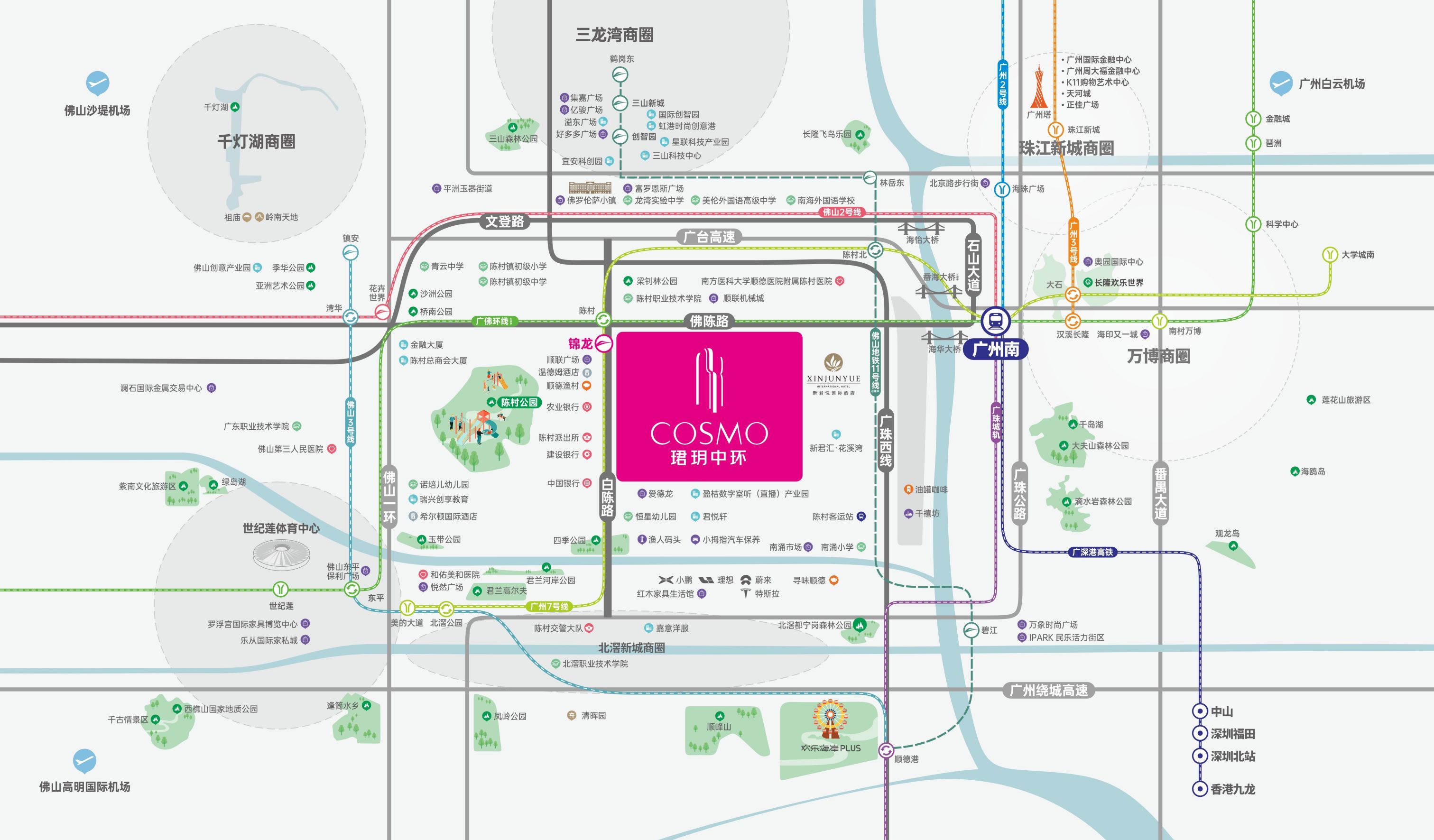 地铁:广州地铁7号锦龙站就在项目楼下,下楼就能到达地铁口,4站到达广州南站;佛山地铁2号线起始广州南站贯穿整个佛山东西。
