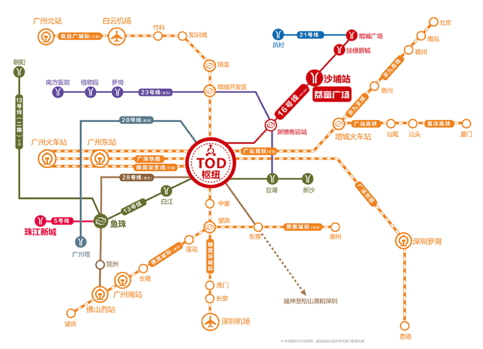 交通增速可期 地铁 16 号线规划,十六号线沙浦站约 500 米。项目更是邻近东部交通 枢纽中心,未来 16 号线 2 站转乘可换乘 9 大枢纽线,更能换乘 13 号线通达天河,价值可期。