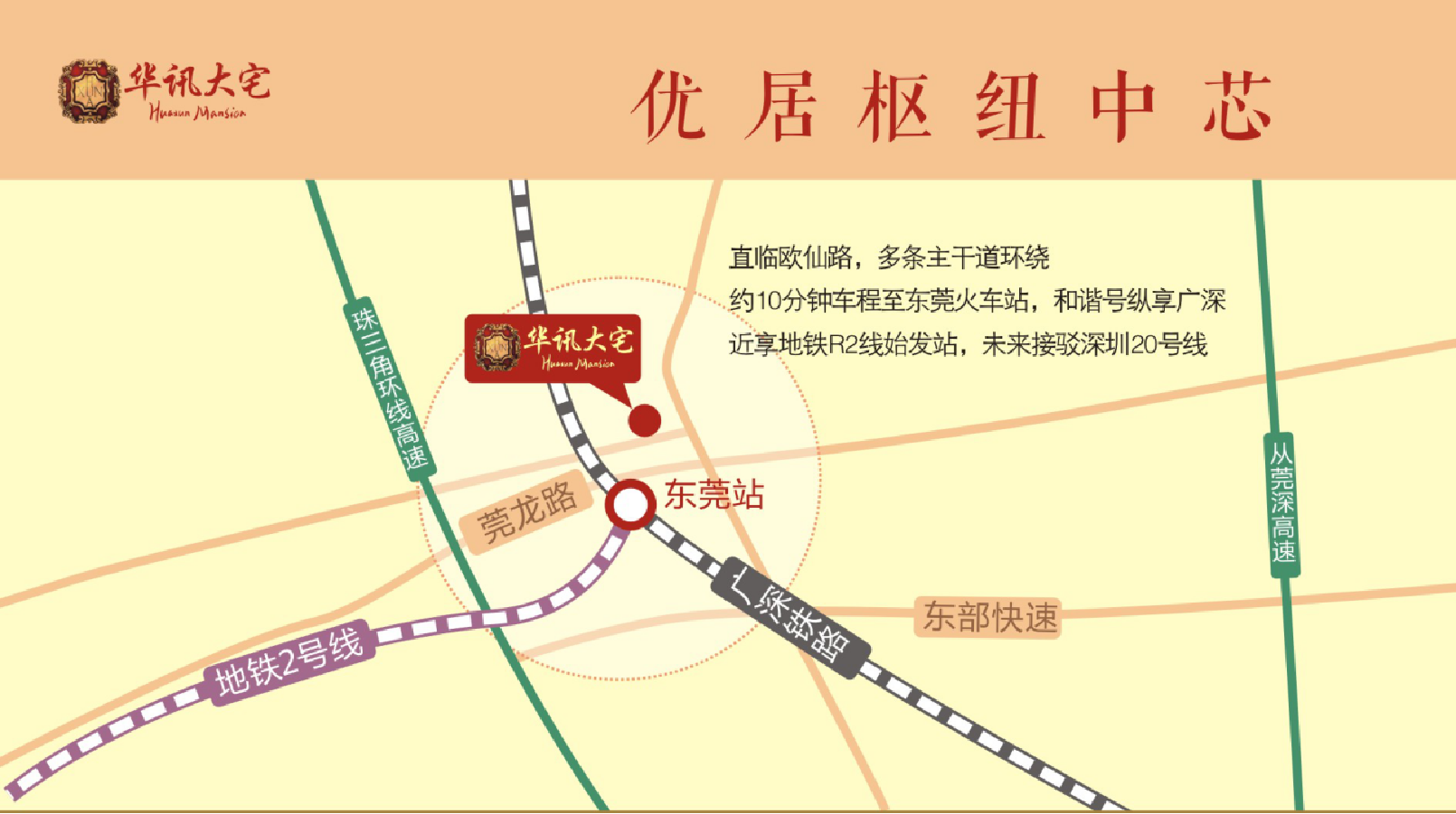 高速:15分钟接驳莞深高速,30分钟轻松直抵深圳腹地,动车:8分钟车程达东莞火车站,1站直达广州,3站深圳主城,R2线地铁:2站到东城、6站到南城CBD