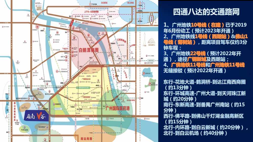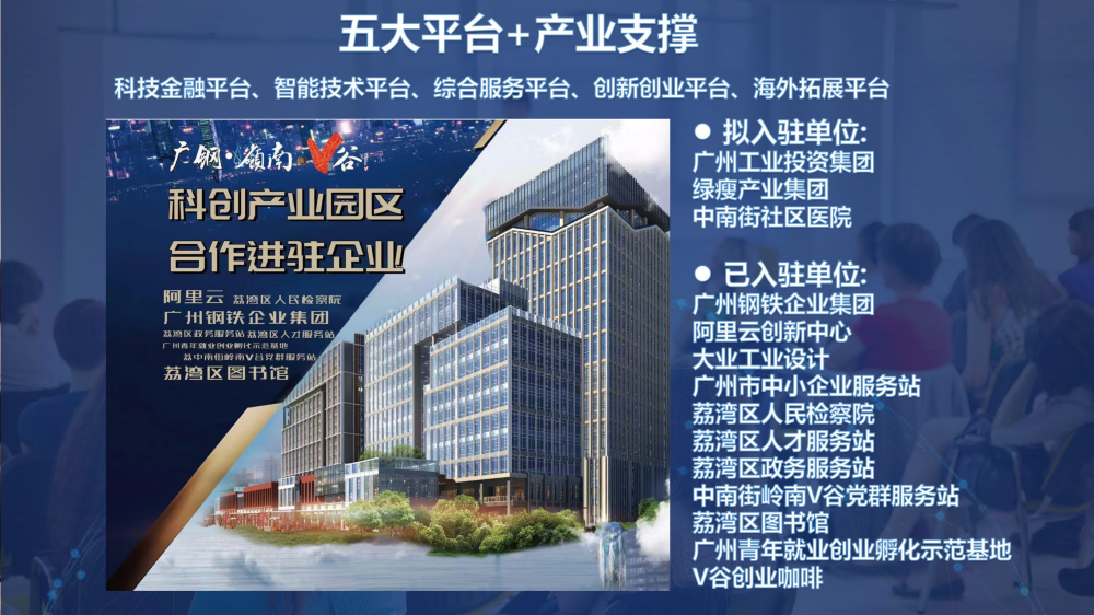 岭南V谷总规模超53万㎡,占地22万㎡,东靠广珠高速西线,南瞰珠江支流—西江,西联花地大道南,北邻广州环城高速南线,涵括产业办公、独栋写字楼、精品酒店、创意办公、商业等业态,坐拥1.5公里一线江景,营造舒适的办公居住环境,丰富商务休闲生活配套,以生产、生态、生活一体化模式创造区域标杆。 岭南V谷共分ABCD区,占地22万㎡,其中ABC三区占地17万㎡,总建筑面积约53万㎡,D区占地5万㎡。 岭南V谷将打造价值创新园区,引进科技创新型龙头企业,构建全方位集约服务,打造集研发、创业孵化、商务办公、集成制造、销售配送等业态于一体的产业生态链,成为广佛合作桥头堡。