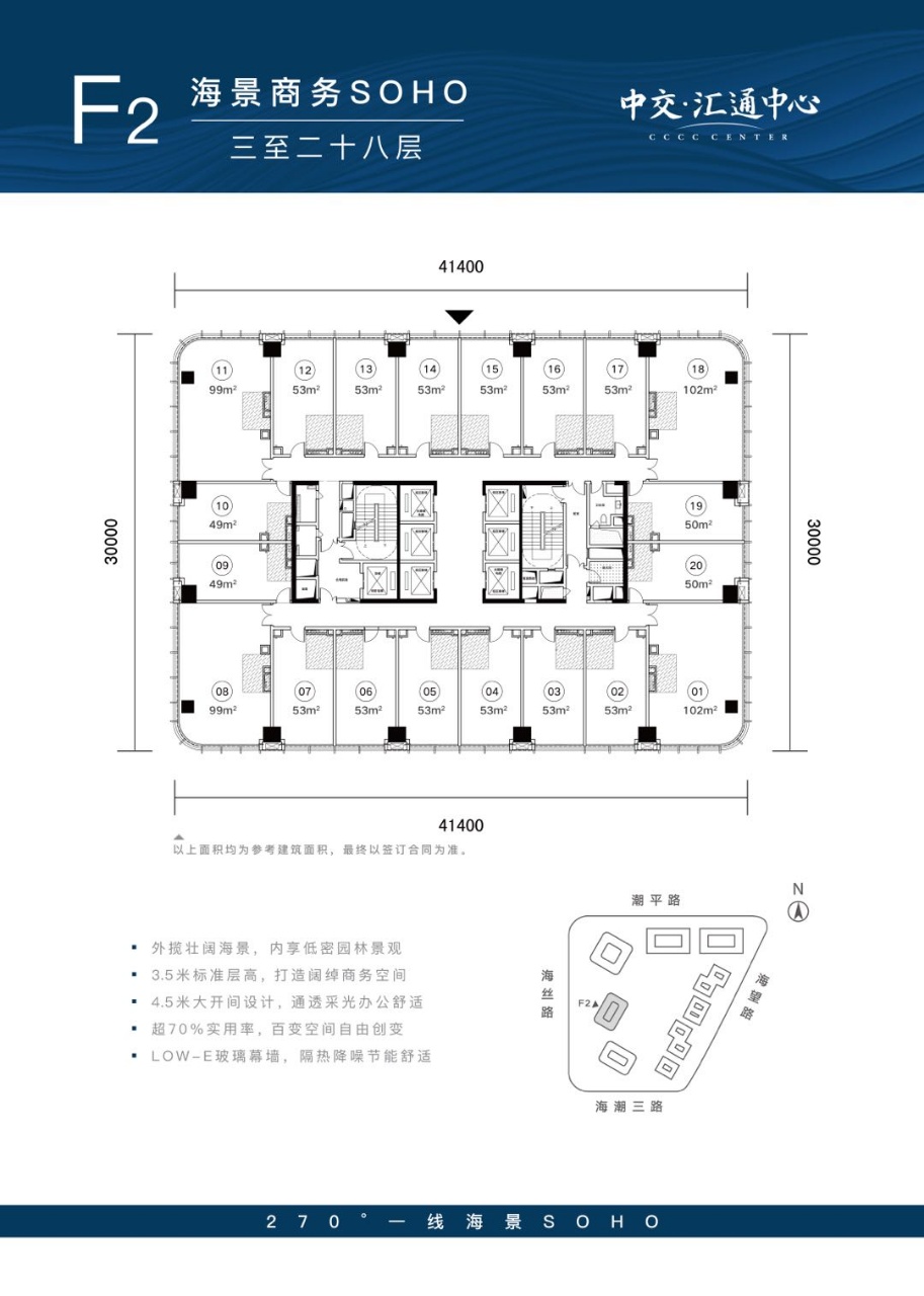 1. 作为明珠湾CBD的地标建筑,中交汇通中心三面环海,270°无敌海景,是区内商办物业的形象标杆。