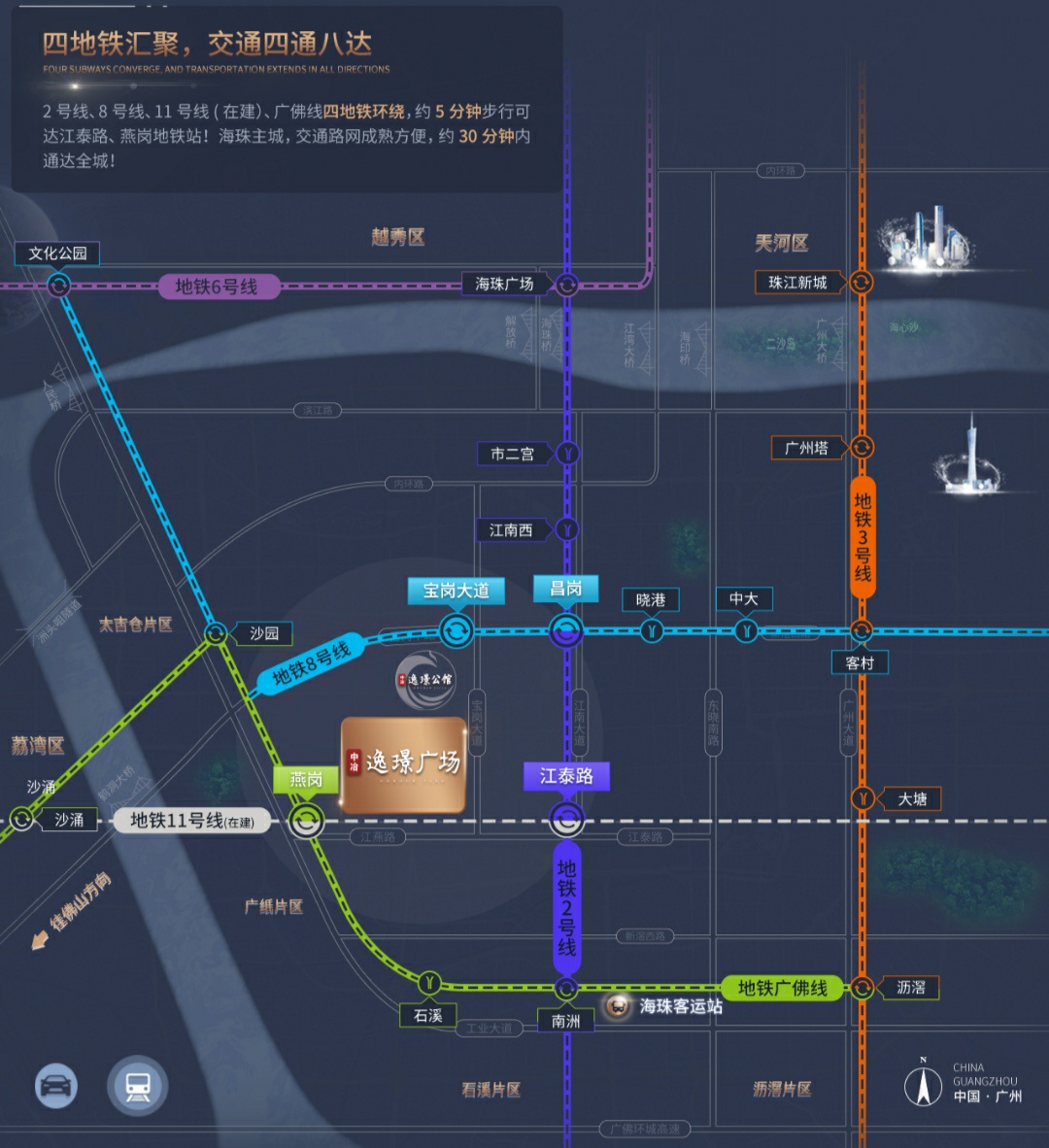 【交通 】4地铁交汇,做全广州房东。约600米抵达2号线江泰路站、广佛线燕岗站,约800米抵达8号线宝岗大道站,2号线、8号线、广佛线、11号线四线交汇,轻松串联丰盛生活圈、消费圈、社交圈。