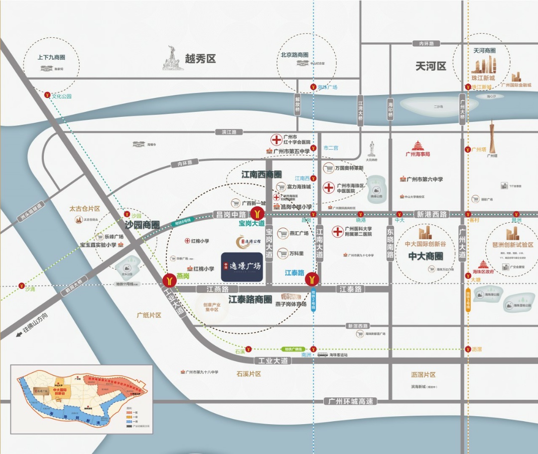 2.【商业 】4商圈交汇,海珠醇熟商圈。昌岗、江南西、乐峰、江泰路四大商圈环绕,高品质生活荟萃,宜商宜居。