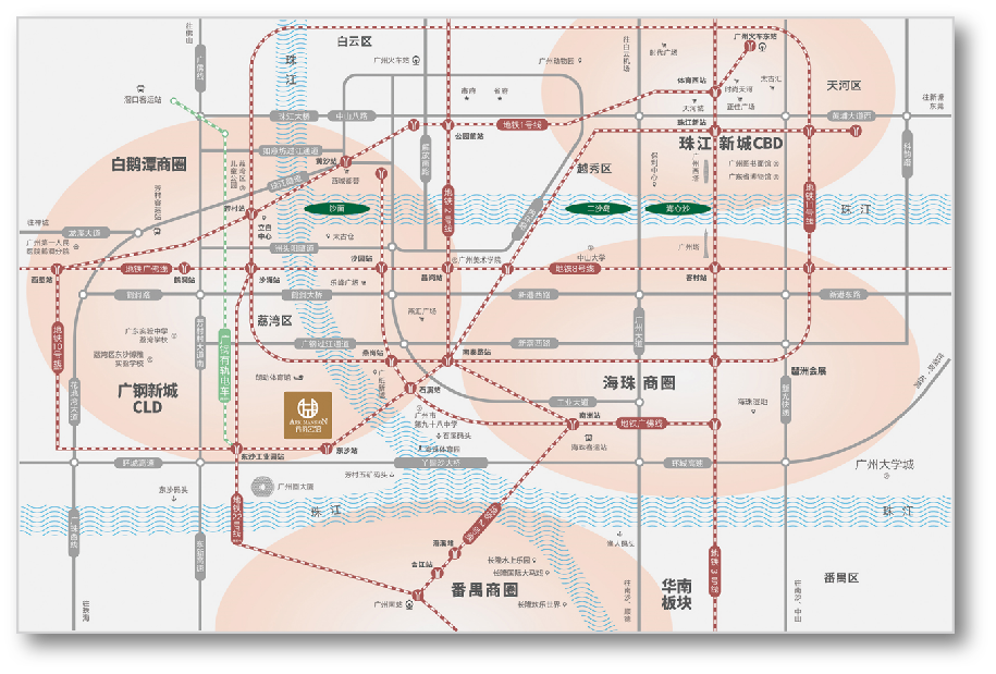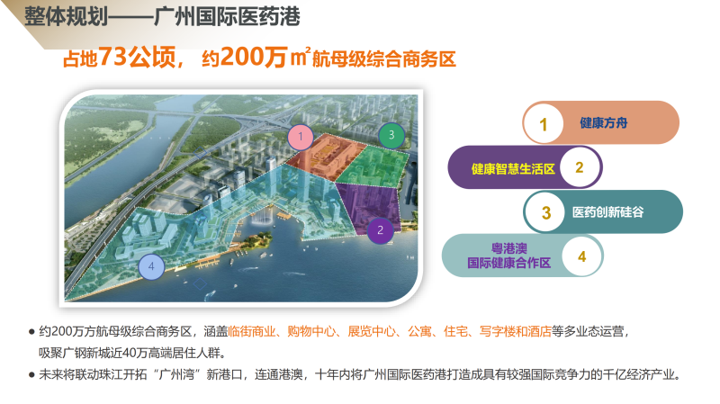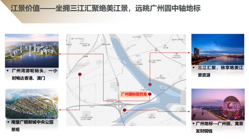 1.【区位 】广州国际医药港地处白鹅潭经济圈,毗邻珠江,周边广钢新城、广船片区和广纸新城三大片区环绕,是广州大型生活区和商务区。