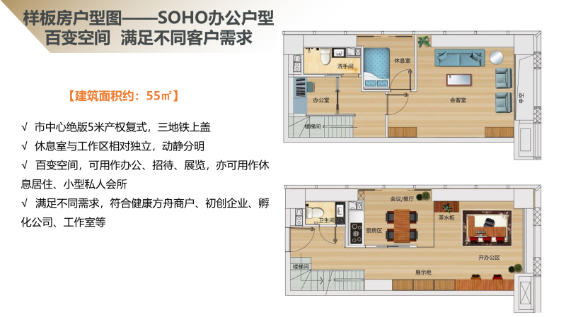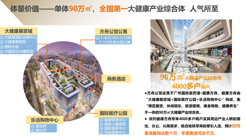 4.【产品 】广州医药港总占地73万㎡,总建筑面积为200万㎡,共分四期开发,涵盖多种产业,临街商业、购物中心、展览中心、公寓、住宅、写字楼和酒店等。现一期推出方舟公馆商业产品,建面约30-76㎡灵动空间,5米层高,轻奢双钥匙、三钥匙,自住投资两不误。