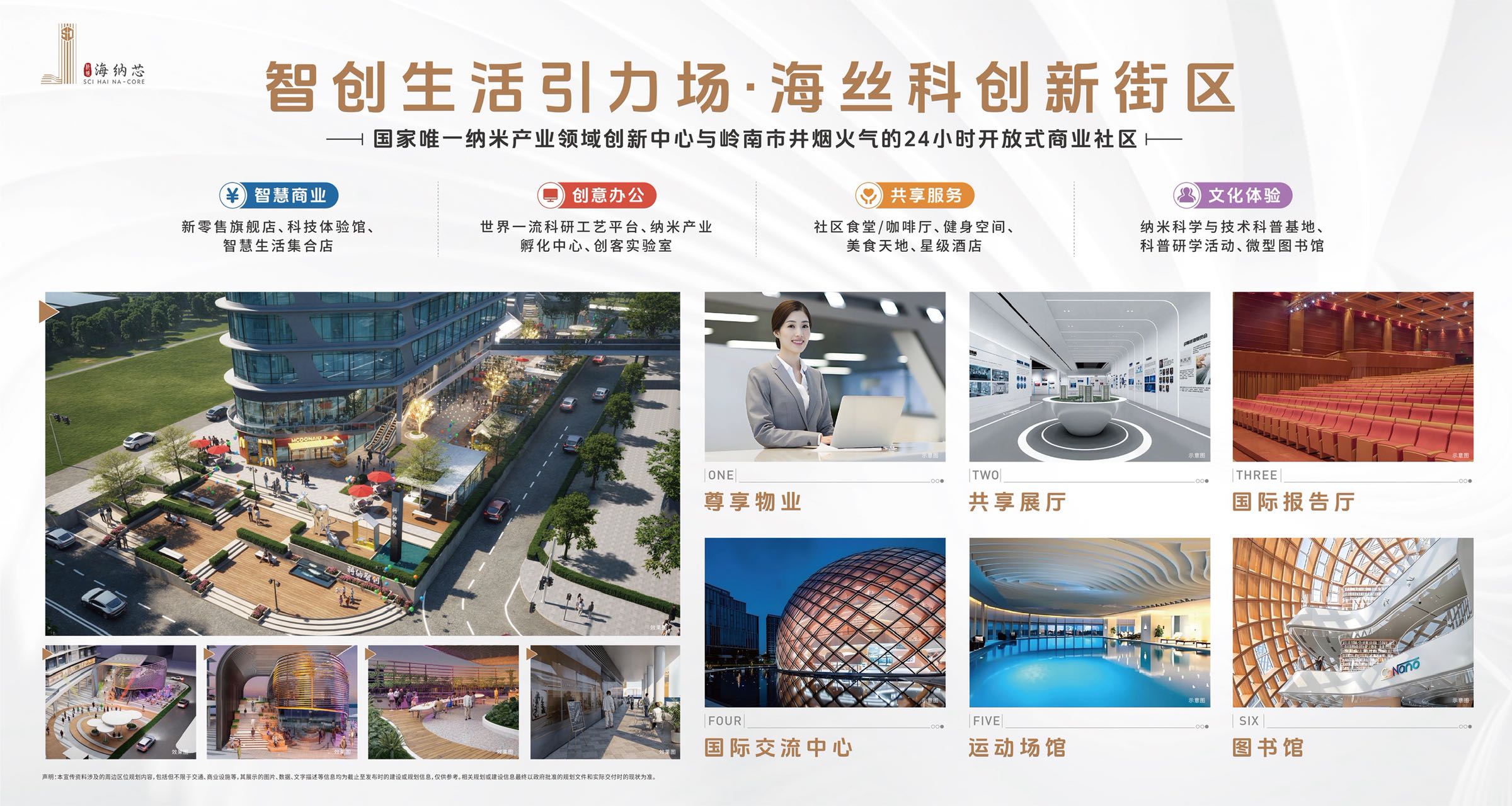【老黄埔当红资产 双层空间 双倍享受】4.5 米上下两层设计,约 100%使用率。主题外立面现代建筑风格,弧形建筑 布局和流动空间组合,与一、二期地块充分融合,完成了以“纳米圆”为概念的超级城市景观。